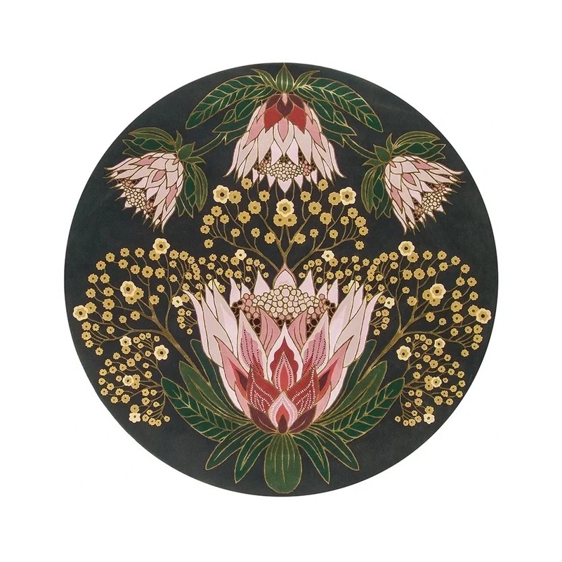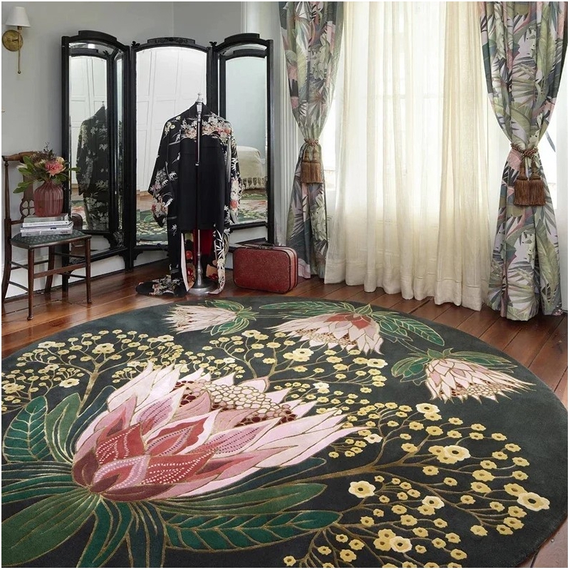 Ковер можно выполнить из акрила или из натуральной шерсти в разных размерах (для уточнения цены нужного вам размера обратитесь к менеджеру). Ковер круглой формы с изысканным ботаническим орнаментом. На глубоком тёмном фоне распускаются крупные протеи и ветви мелких цветов, выполненные в мягких оттенках розового, кремового и зелёного с золотистыми акцентами. Богатый рисунок напоминает декоративную живопись и придаёт интерьеру утончённость и теплоту. Такой ковер станет выразительным центром композиции, добавляя пространству артистичность и природную элегантность.