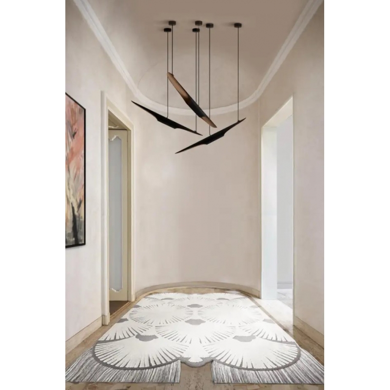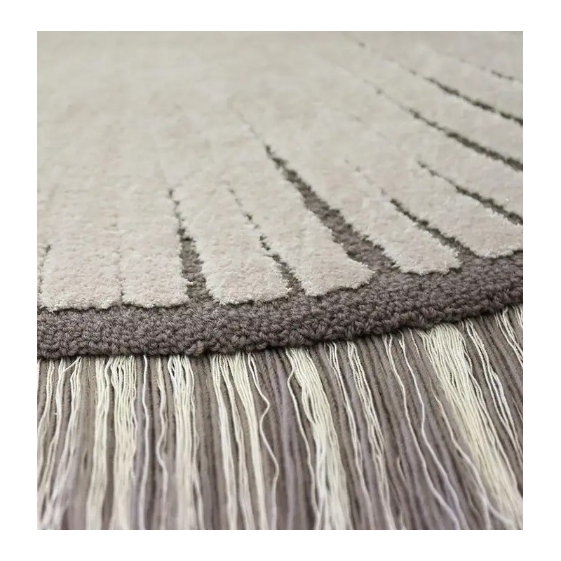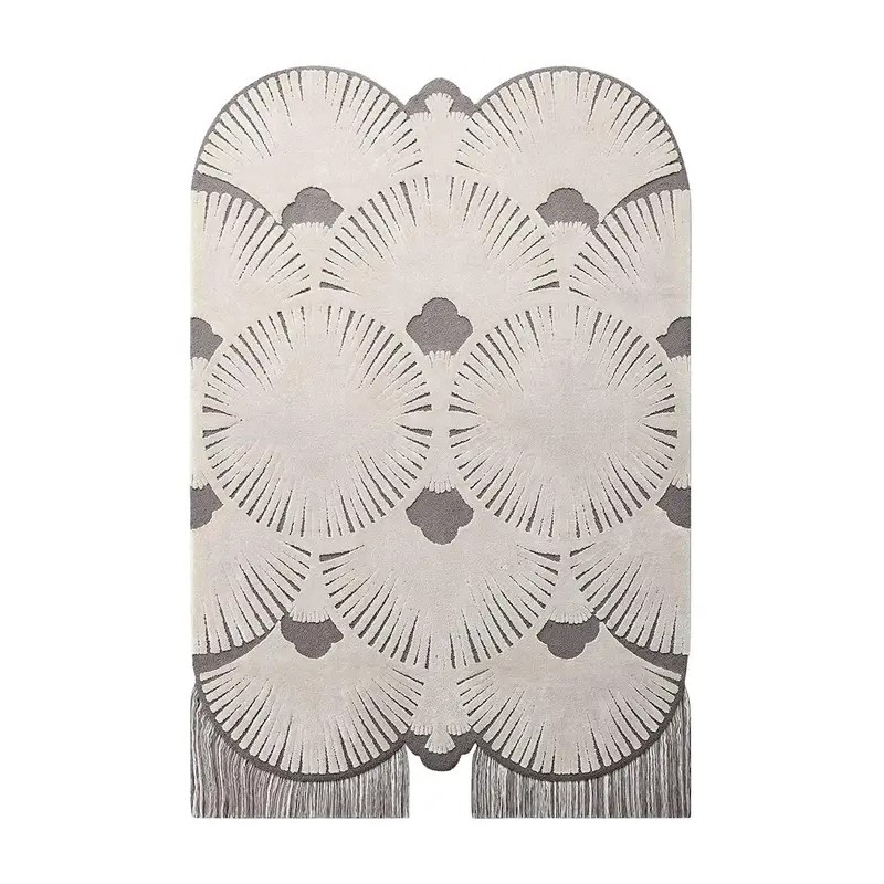 Ковер можно выполнить из акрила или из натуральной шерсти в разных размерах (для уточнения цены нужного вам размера обратитесь к менеджеру). Ковер с изысканным геометрическим узором и декоративной бахромой, вдохновлённый эстетикой ар-деко. Мягкий контраст серого и молочного оттенков создаёт утончённый ритм, а округлые формы придают рисунку ощущение движения и легкости. Оригинальная форма края и акцентная бахрома делают этот ковер не просто предметом декора, а настоящим арт-объектом, идеально подходящим для элегантного современного интерьера.