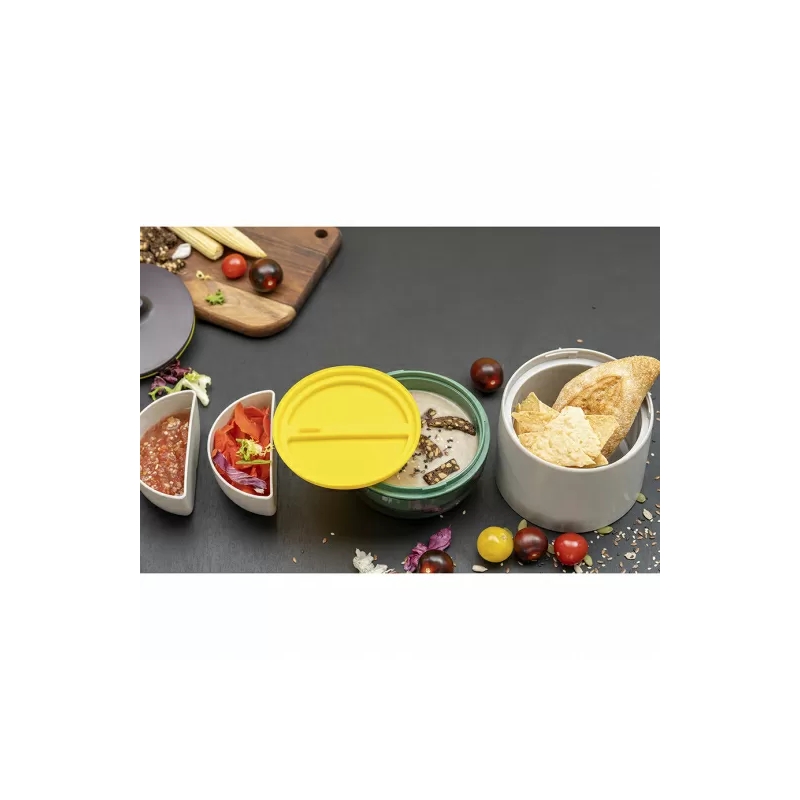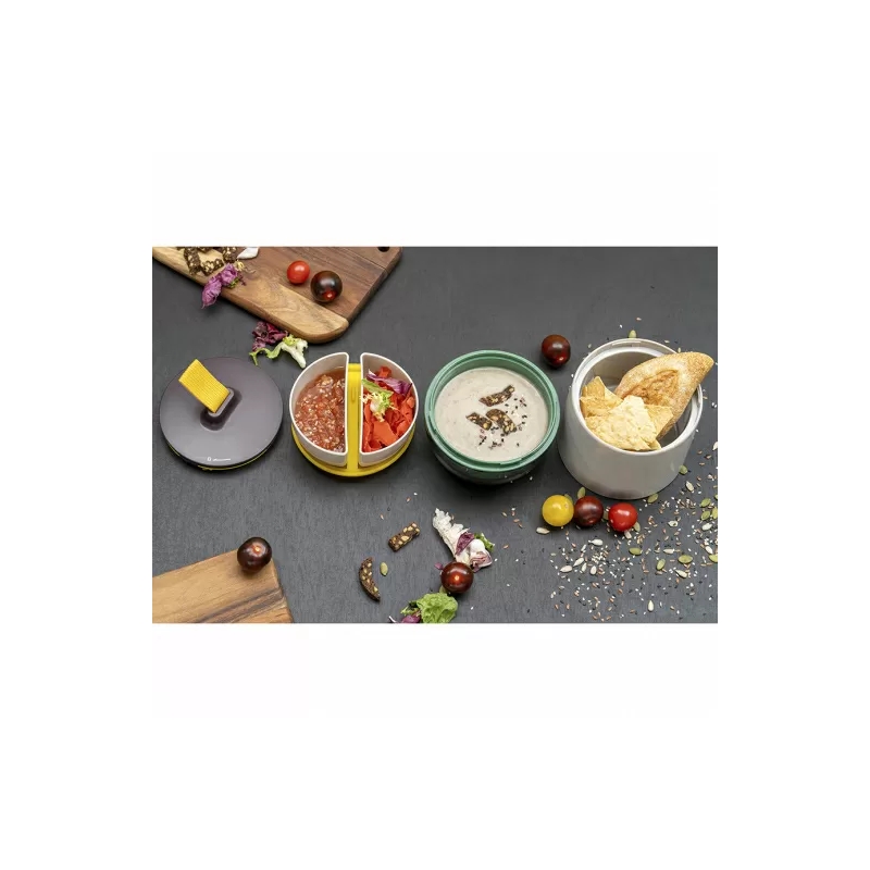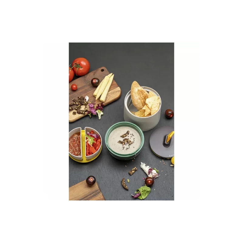 Ланч-бокс Meals от бренда Smart Solutions – стильный, удобный и практичный контейнер для еды с собой. Особенности и преимущества: - Конструкция ланч-бокса состоит из двух частей, надежно соединенных между собой. Верхний контейнер идеально подходит для салатов, первых и вторых блюд. Нижний поделен на два отсека, которые можно использовать под фрукты, мюсли и снеки. - Специальный ободок из силикона обеспечивает плотное прилегание крышки и защиту от протекания. Однако не рекомендуется переворачивать или трясти контейнер. - Благодаря термостойким свойствам емкости можно греть в СВЧ и хранить в холодильнике. - В составе материалов отсутствуют вредные для здоровья соединения, в том числе бисфенол-А. - Ланч-бокс легко разбирается на составляющие части для тщательной очистки. - Перед первым применением рекомендуем промыть все части контейнера в горячей воде. Подготовка контейнера к использованию: - Открутить крышку контейнера против часовой стрелки. - Промыть контейнер и все его части в горячей воде. - Немного разработать руками уплотнительную резинку на крышке контейнера. - Несколько раз повторить процесс открывания-закрывания крышки контейнера. - Положить в контейнер любимое блюдо и закрыть крышку до характерного щелчка. - Стрелка на крышке указывает направление закрывания контейнера. Если все сделано правильно, крышка будет плотно прилегать и при этом легко открываться. И после такой подготовки ланч-бокс будет 100% герметичен. Материалы: АБС-пластик, силикон, полипропилен, нейлон. Высота: 15 см. Диаметр: 12 см. Объем: 800 мл. Цвет: светло-серый/зеленый. Размеры в упаковке (ШхГхВ): 12 х 12 х 15 см Размеры без упаковки (ШхГхВ): 12 х 12 х 15 см Вес в упаковке: 0,46 кг Вес без упаковки: 0,46 кг